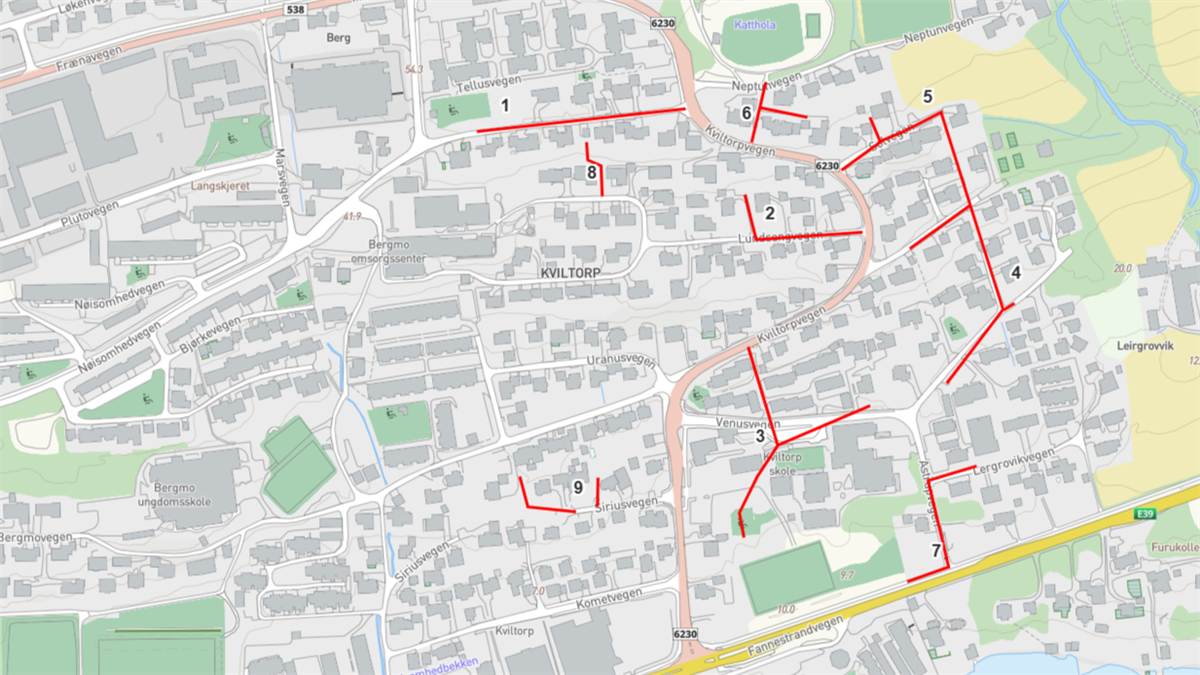 Arbeidet foregår på deler av veger som er avstikkere fra Kviltorpvegen: Nøisomhedsvegen, Lundsengvegen, Venusvegen, Østtorpvegen, Astrupvegen, Solvegen, Neptunvegen, Legrovikvegen, Meteorvegen og Siriusvegen.